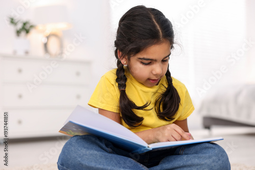 Naklejka premium Cute little girl reading book at home