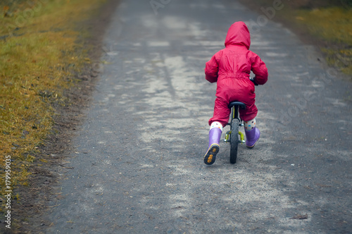 © Tanya, Obraz premium cute little girl riding run bike in the forest