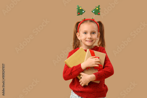 © Pixel-Shot, Naklejka premium Cute little girl with books on beige background. Christmas celebration