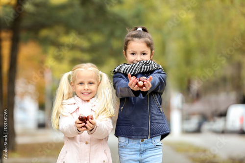 Fototapeta premium Cute little girls in outwear with chestnuts outdoors