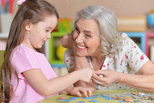 Fototapeta premium Cute little granddaughter and grandmother collecting puzzles