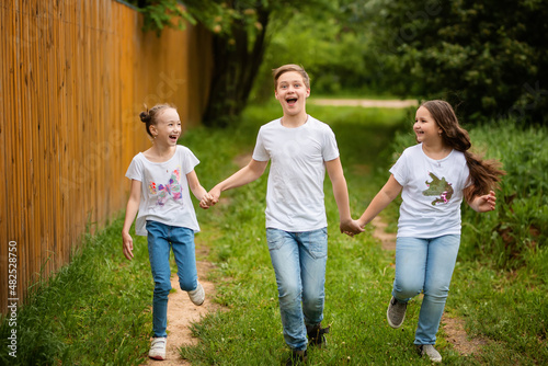 © Олеся Болтенкова, Fototapeta premium Cute little kids are running together on the road. Two sisters and a brother are holding hands, they are having fun, they are happy. The concept of childhood and friendship.