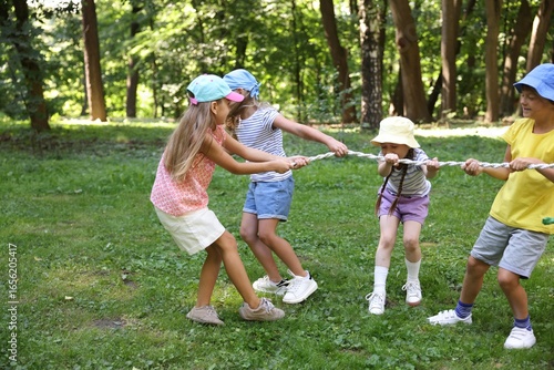 © New Africa, Obraz premium Cute little kids playing tug of war in park