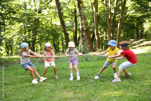 © New Africa, Obraz premium Cute little kids playing tug of war in park