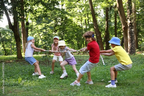 © New Africa, Obraz premium Cute little kids playing tug of war in park