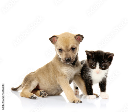 Obraz premium Cute little kitten and puppy on white background