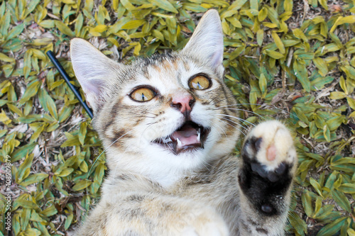 © Azfar.arts, Fototapeta premium Cute little kitten in front of house yard.
