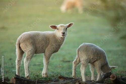 © Lukas Gojda, Obraz premium cute little lambs on fresh green meadow during sunrise