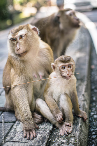 © ale_koziura, Fototapeta premium Cute little monkey holds a wand in the teeth. Thailand, Phuket, Monkey hill.