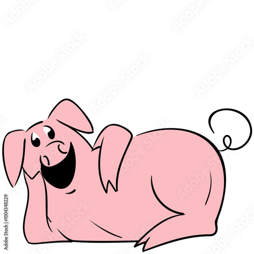 © Ebarcala, Naklejka premium Cute little pig posing lying down seen from the front laughing and with his face resting on one hand