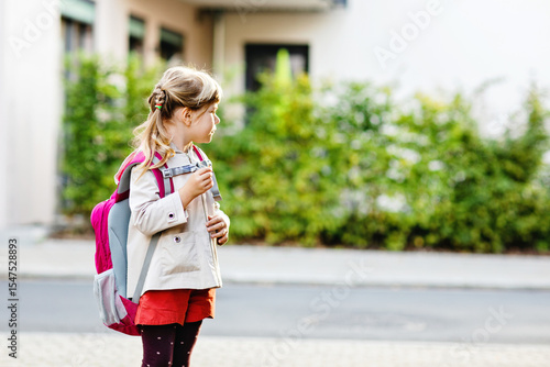 © Irina Schmidt, Naklejka premium Cute little preschool girl going to playschool. Healthy toddler child walking to nursery school and kindergarten. Happy child with backpack on the city street, outdoors.