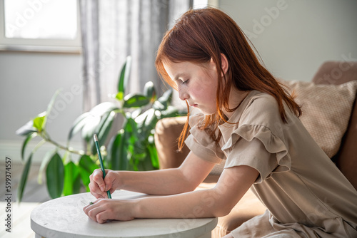 Obraz premium cute little preteen girl drawing with pen while sitting at desk at home,...
