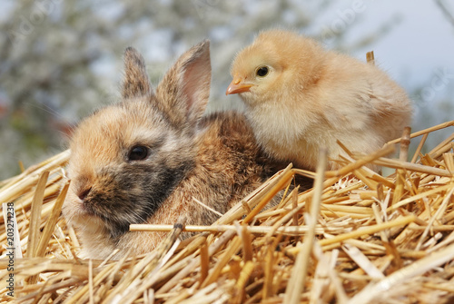 © Uros Petrovic, Fototapeta premium Cute little rabbit bunny and chick are best friends on straw pile