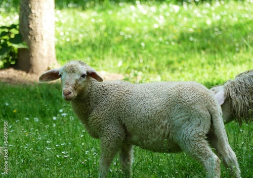 © moreidea, Obraz premium Cute little sheep on the farm animal background