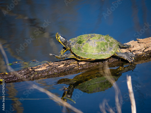 © robitaillee, Obraz premium Cute little turtle takin sun and stretching on wood in water