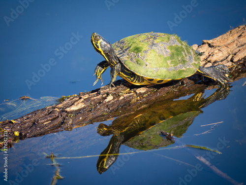 © robitaillee, Fototapeta premium Cute little turtle takin sun and stretching on wood in water