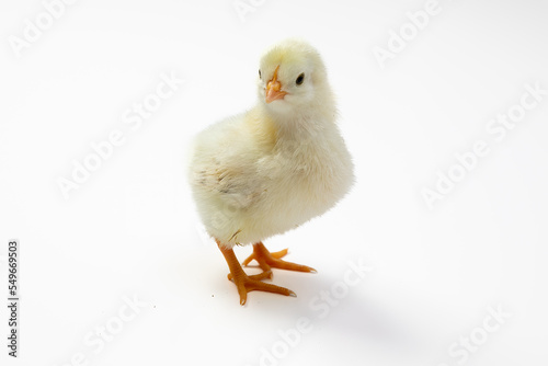 Obraz premium Cute little yellow baby chicken isolated on white background