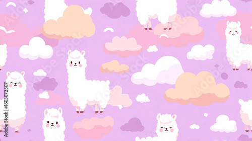 Obraz premium Cute Llama and Cloud Seamless Pattern, Pastel Colors, Whimsical Design,...