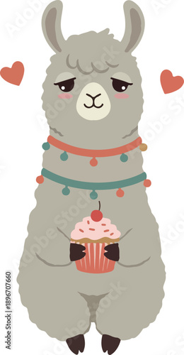 Obraz premium Cute Llama Holding Cupcake With Hearts Adorable Pet Vector Art