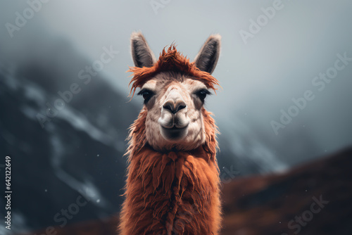 © Uliana, Obraz premium Cute llama in the mountains. Alpaca in the valley on the background of the mountains.