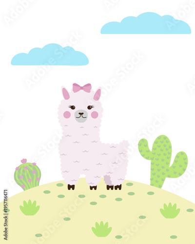 Fototapeta premium Cute llama with a pink bow and cacti