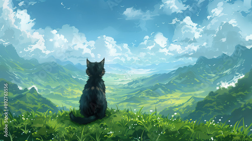 © Japanese_Brush, Fototapeta premium cute lovely black anime cat sitting in the alps and watching the scenery, manga wallpaper