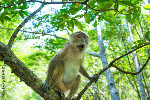 Fototapeta premium Cute macaque monkey sitting on tree in tropical mangrove forest with green...