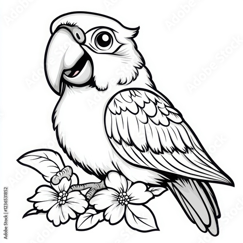 © Goody ART, Obraz premium Cute Macaw in Black and White Style with Flowers Illustration