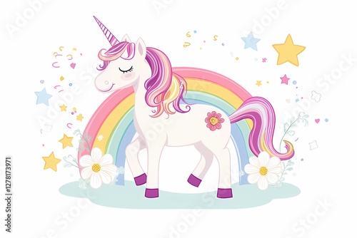 © Penkinn, Naklejka premium Cute magical unicorn with rainbow, flowers, star. flat cartoon illustration. kawaii style