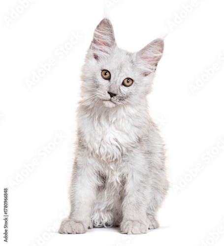 Obraz premium Cute maine coon kitten sitting and looking at camera on white background
