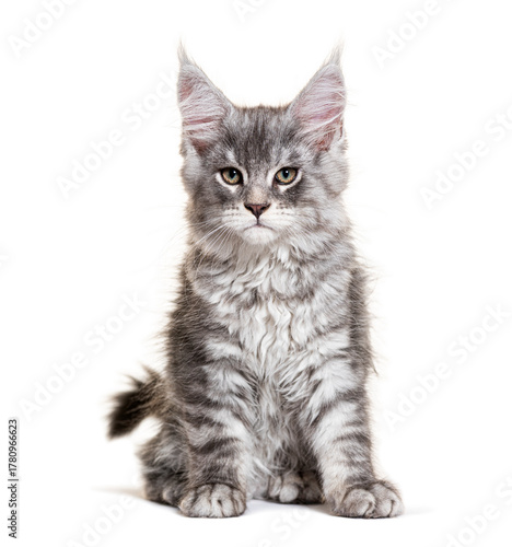Obraz premium Cute maine coon kitten sitting and staring on white background