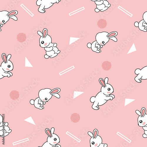 © morspective, Fototapeta premium cute many white rabbit animal seamless pattern white object wallpaper with design light pink.