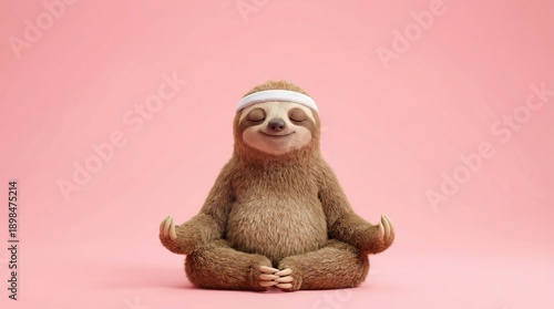 Fototapeta premium Cute meditating sloth in yoga pose with headband on pink background