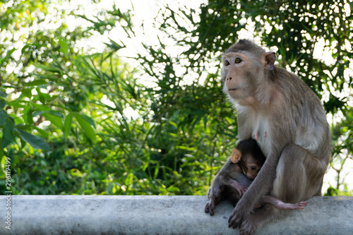 © sKjust, Obraz premium Cute monkey. Monkey mother with baby love sitting on steel