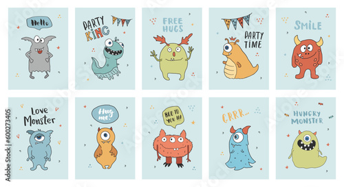 Fototapeta premium Cute monsters cards set. Cartoon monsters collection. Vector illustration