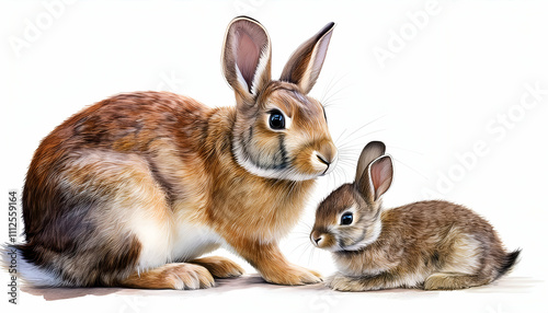 © Mohana, Fototapeta premium Cute mother and baby rabbit full view on a white background, watercolor