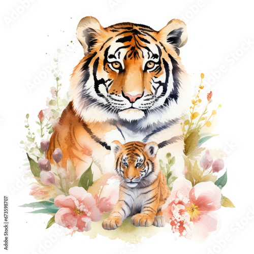 © Creative Artist, Naklejka premium Cute mother tiger with baby with flowers Illustration, Generative Ai
