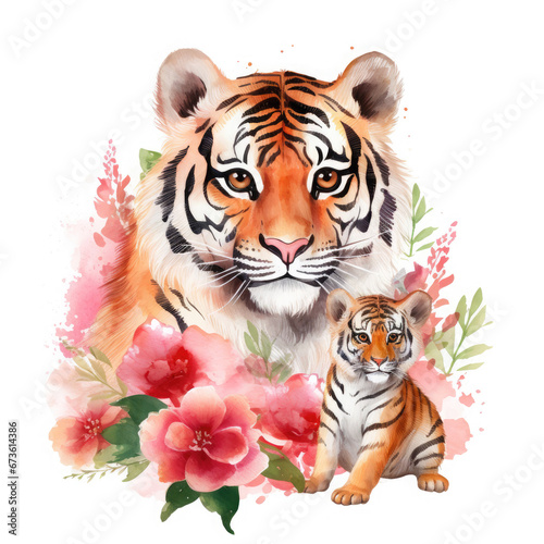 © Creative Artist, Naklejka premium Cute mother tiger with baby with flowers Illustration, Generative Ai