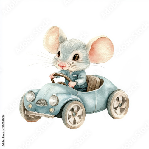Naklejka premium Cute mouse driving a toy car - watercolor illustration, children's book, bedroom decor