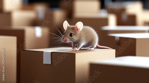 Fototapeta premium Cute Mouse on Cardboard Box in Warehouse Setting