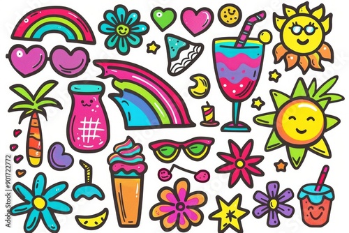 Fototapeta premium Cute neon doodle stickers, hearts, rainbows, flowers, sunglasses, beach and sun, smoothies, ice cream, vivid colors