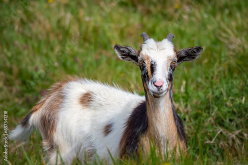 Naklejka premium Cute newborn baby mountain goat goat during springtime in the mountains