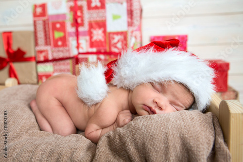 © ulza, Obraz premium Cute newborn baby sleeps in a santa claus hat close-up
