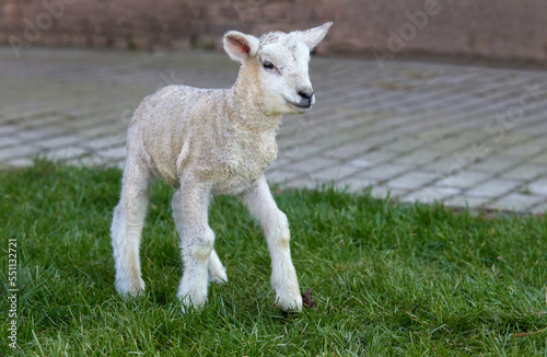 © erwin, Obraz premium Cute newborn white lamb on grass