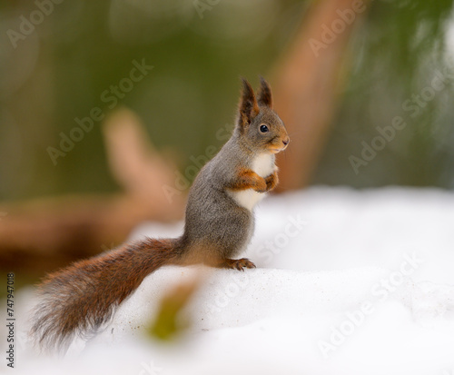Fototapeta premium Cute Norwegian Red squirrel (Sciurus vulgaris) in winter forest
