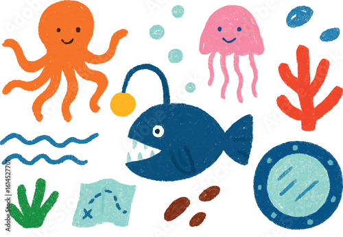© AamirSohail, Naklejka premium Cute Ocean Life Illustration: Octopus, Jellyfish, Anglerfish, Underwater Scene, Childrens Book, Marine Animals, Crayon Texture