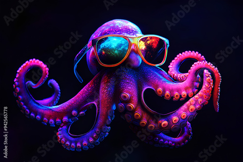 © Noufaldi, Fototapeta premium Cute octopus wearing sunglasses on a neon black background