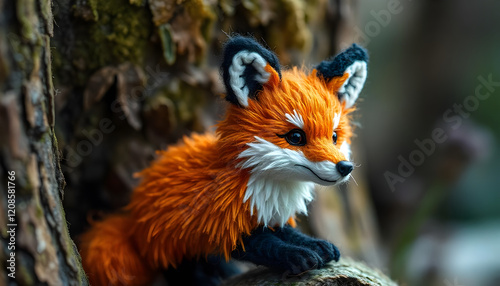 © MonCollection, Fototapeta premium cute orange fox plush toy sitting on tree trunk in nature