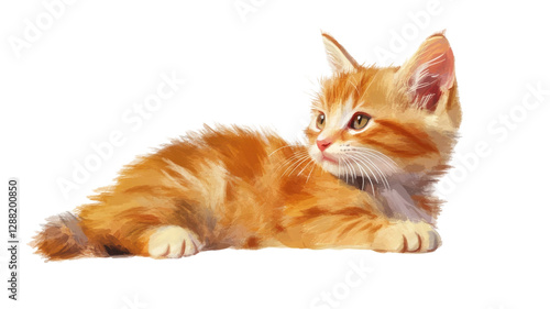 © Zainab, Obraz premium Cute orange kitten lounging comfortably on soft surface with curious expression and fluffy fur