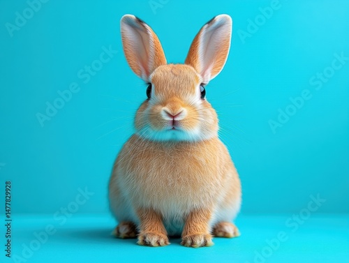 Obraz premium Cute orange rabbit sitting on a vibrant blue background, showcasing its...